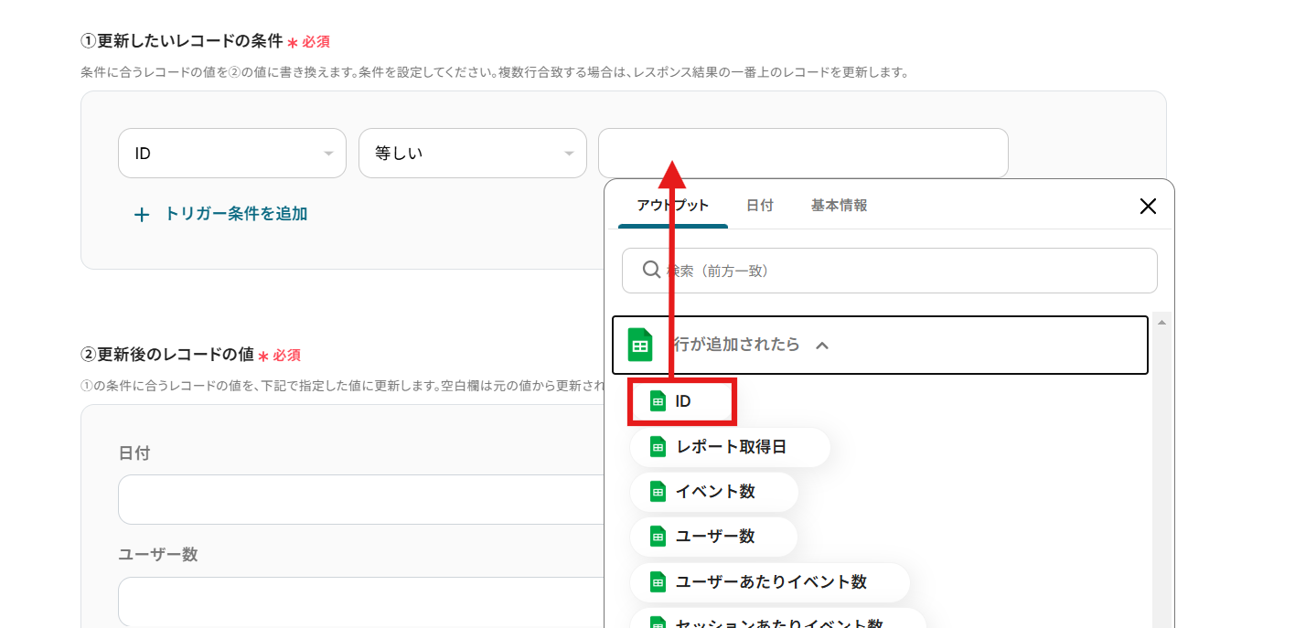 続いて、「更新後のレコードの値」を設定していきます。 ボックスの項目名に等しいものを、アウトプットから選択して入力してください。