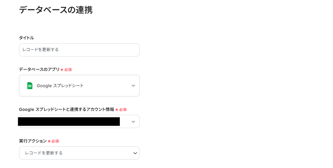 「スプレッドシートID」は、候補から選択しましょう。 レコードが更新された際に、最新レポートに更新したいシートを選択してください。
