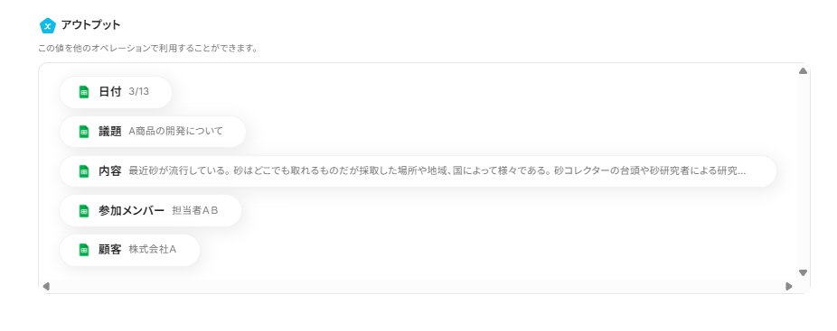 テストが成功すると画面下部にアウトプット としてGoogle スプレッドシートのデータが表示されます。 このテストにより抽出できたアウトプット=Google スプレッドシートのデータをGoogleドキュメントに連携することが可能 です。