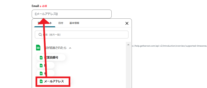 例えば、Google スプレッドシートで従業員管理をしている場合、以下のように設定するとGoogle スプレッドシートから取得した従業員のメールアドレスをHarvestに挿入できます。