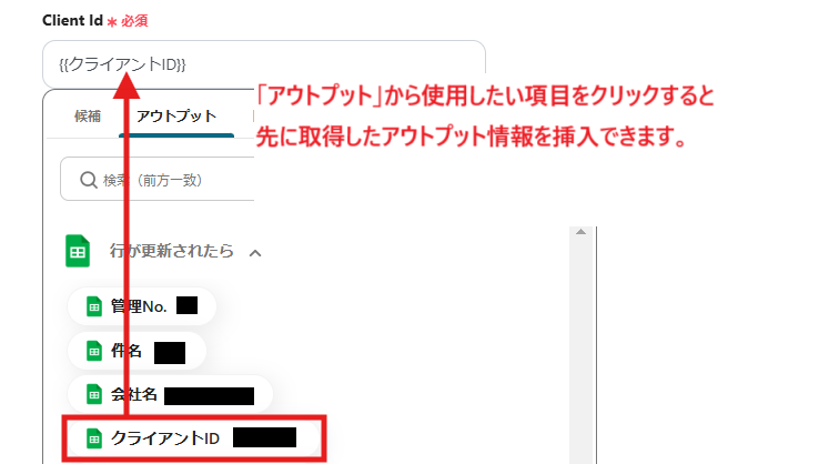 先ほど取得したGoogle スプレッドシートのアウトプット情報を活用し、入力できます。