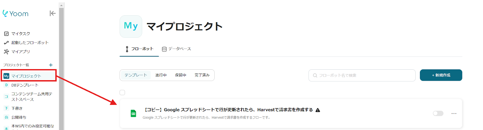 ここからは、Yoomのテンプレート【Google スプレッドシートで行が更新されたら、Harvestで請求書を作成する】という連携フローを使って設定をしていきます。
