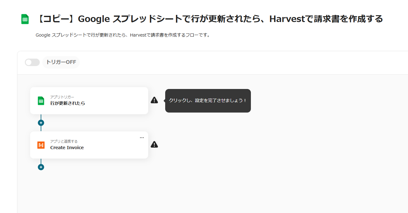 これで【Google スプレッドシートで行が更新されたら、Harvestで請求書を作成する】というフローが完成です。
