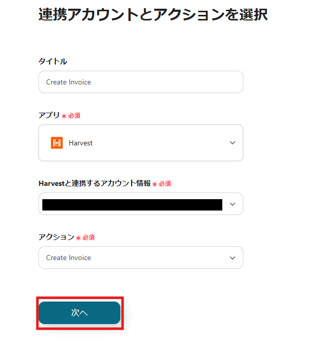 2) アクションは「Create Invoice」を選択し、「次へ」をクリックします。