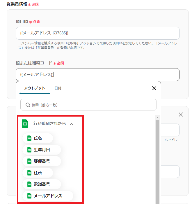 項目IDには「メンバー情報を構成する項目IDを取得」のアウトプットを利用すると簡単に設定ができます。