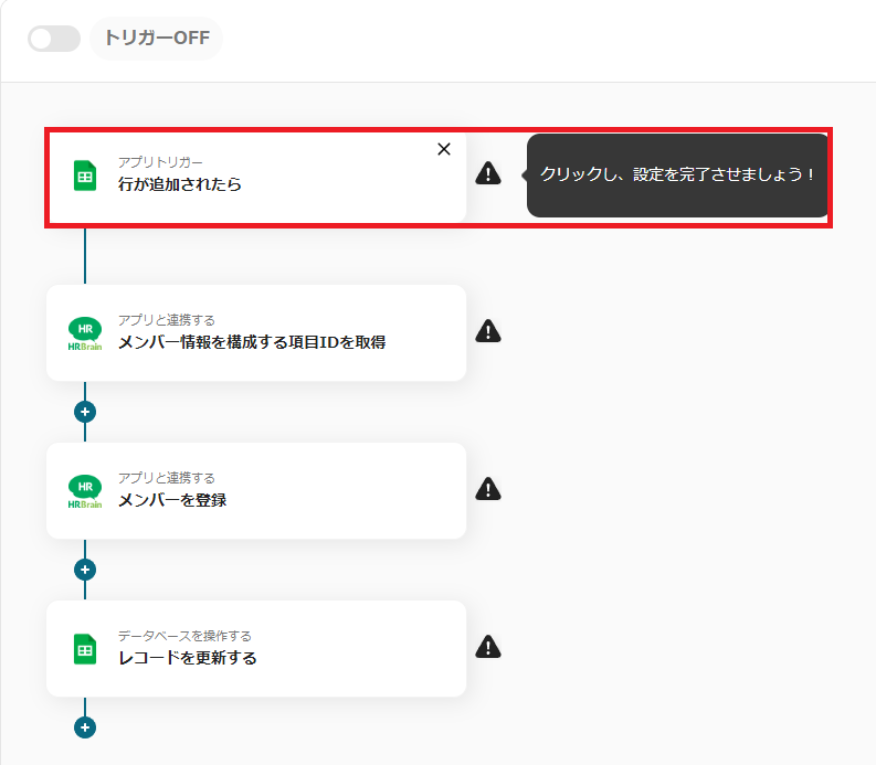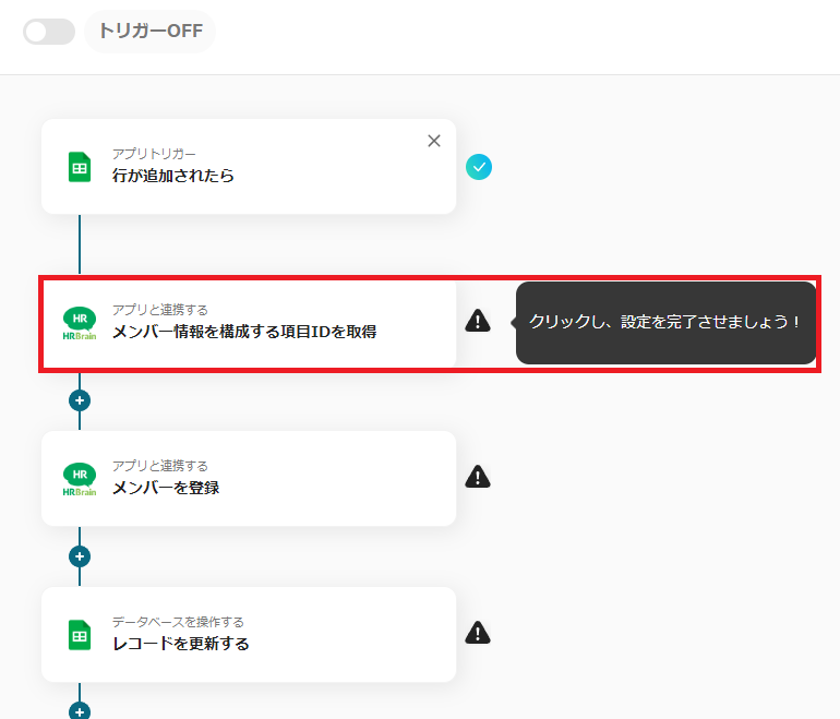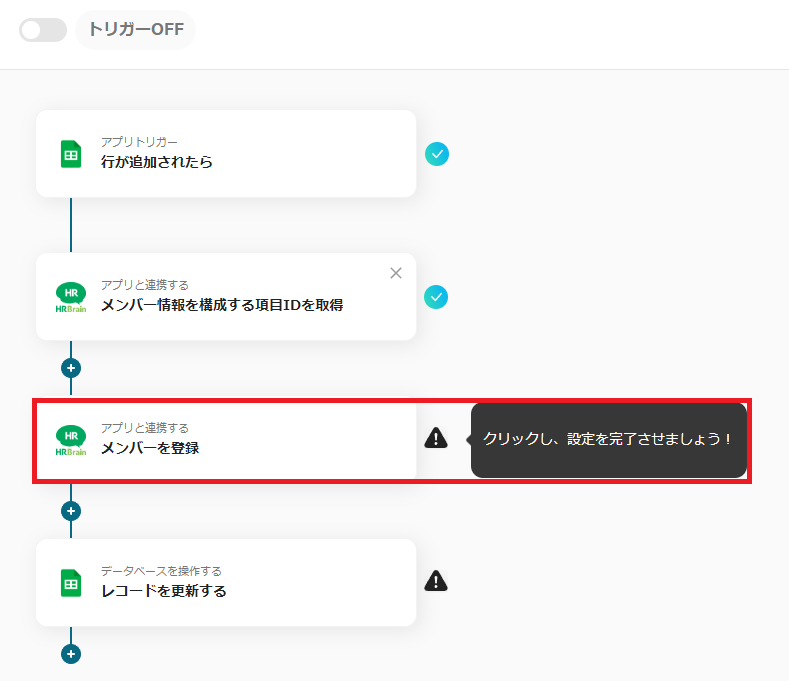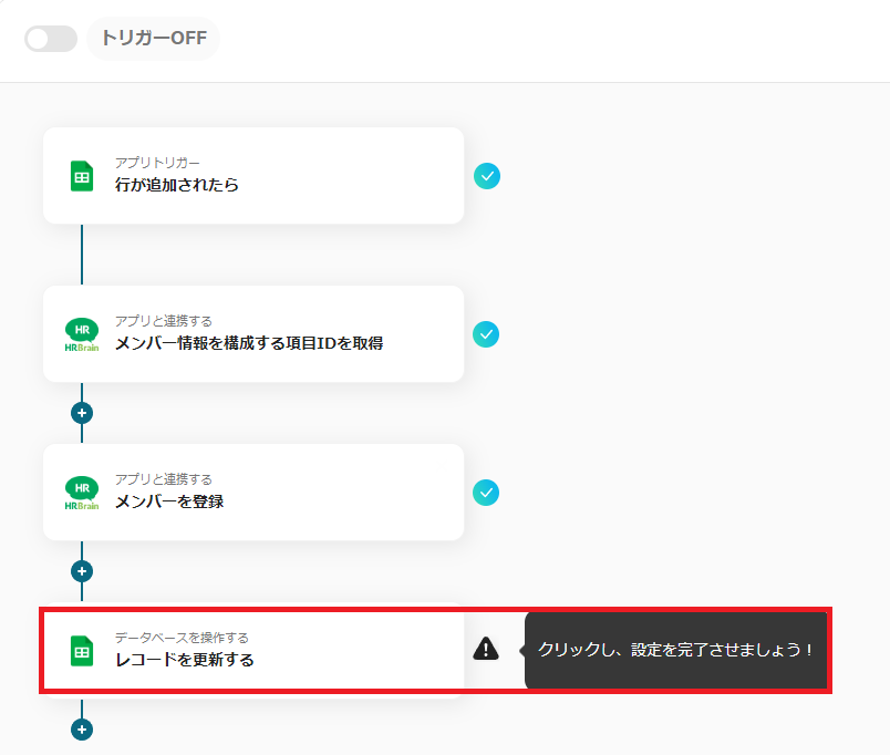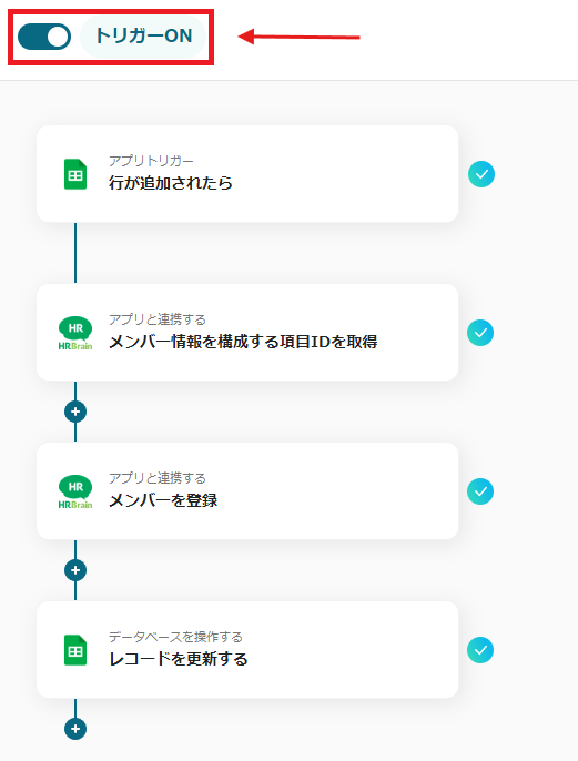 これで「Google スプレッドシートで従業員情報が追加されたらHRBrainに登録する」の設定はすべて完了になります。