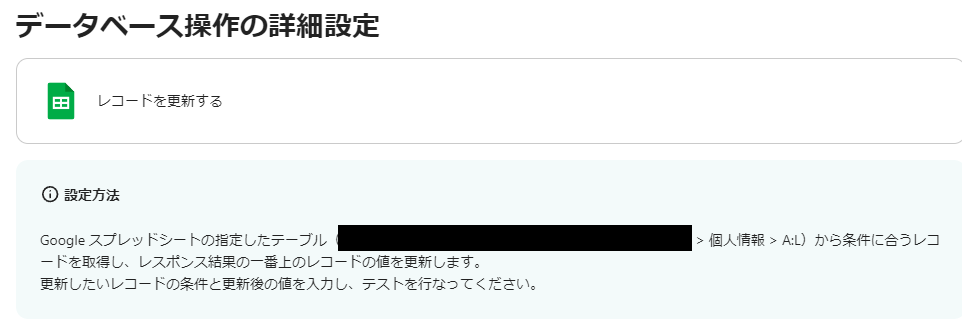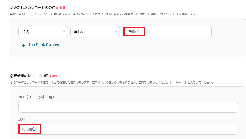 「更新したいレコードの条件」「更新後のレコードの値」を入力していきます。