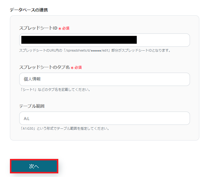 Google スプレッドシートIDはご自身のスプレッドシートを使用してください。