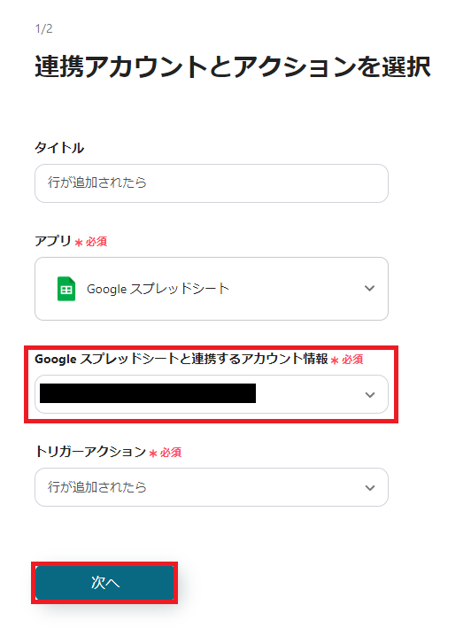 まずは「行が追加されたら」を選択して、設定の確認をしていきます。