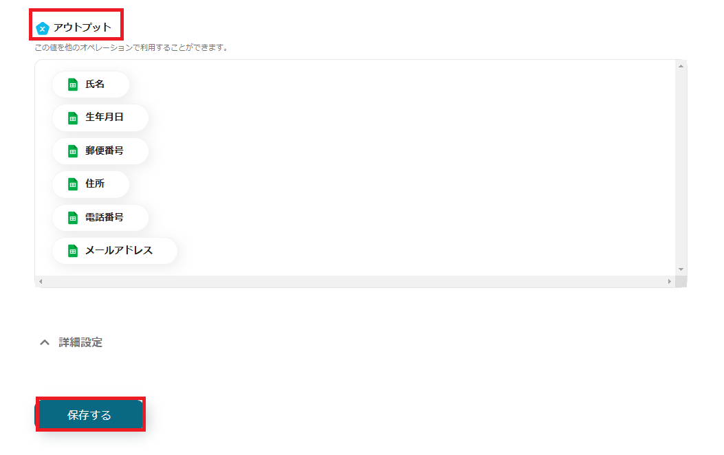 入力欄をクリックすると、アウトプットが使用できるので該当のアウトプットを使用するだけで簡単に設定できます。