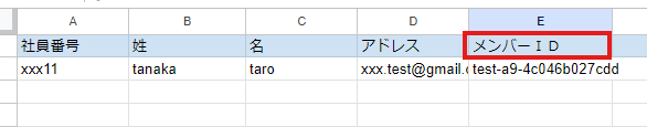 ステップ3で更新対象の従業員を特定するために「メンバーID」が必要になるため、あらかじめGoogle スプレッドシートにメンバーIDを格納しておきましょう。