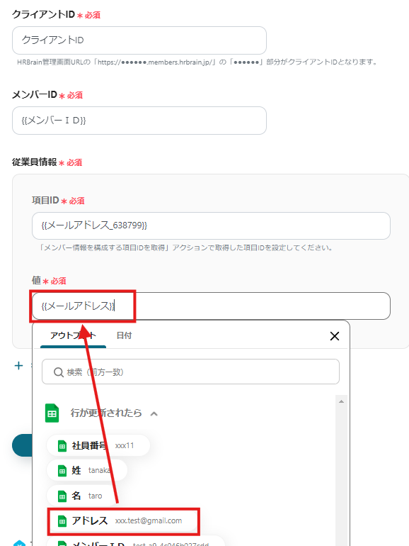 テストが成功すると、指定したGoogleスプレッドシートの項目がアウトプットに反映されます。