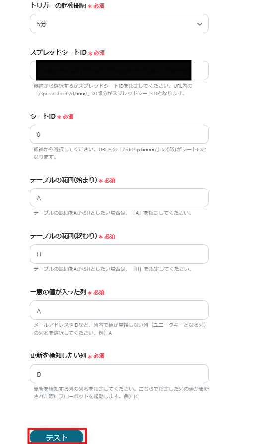 続いてのページでは、GoogleスプレッドシートのIDと範囲の設定を行ってください。