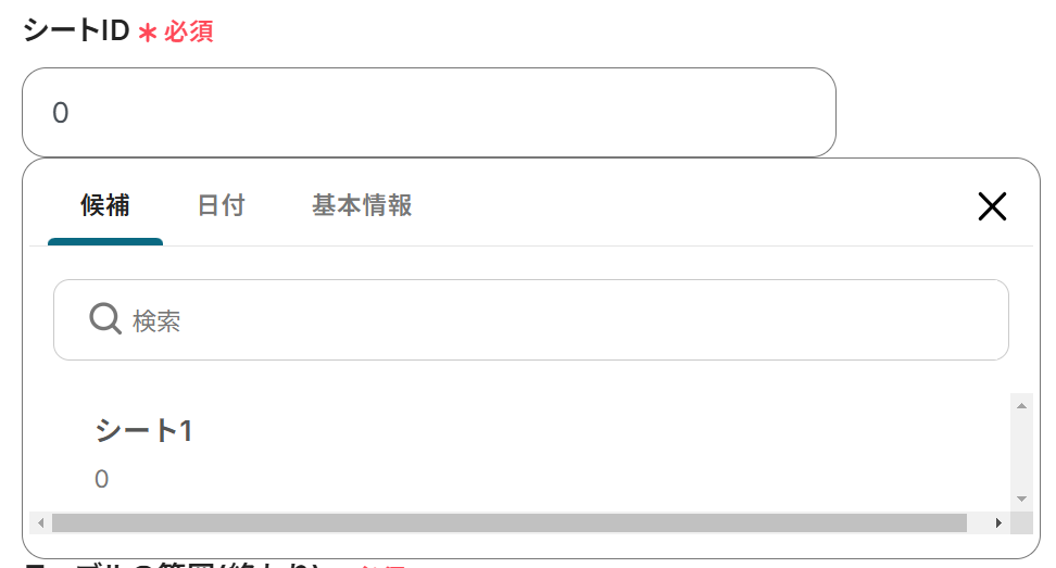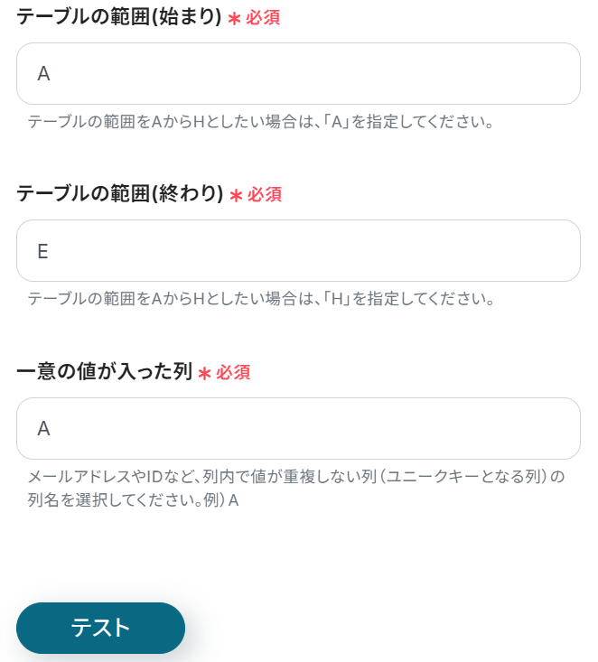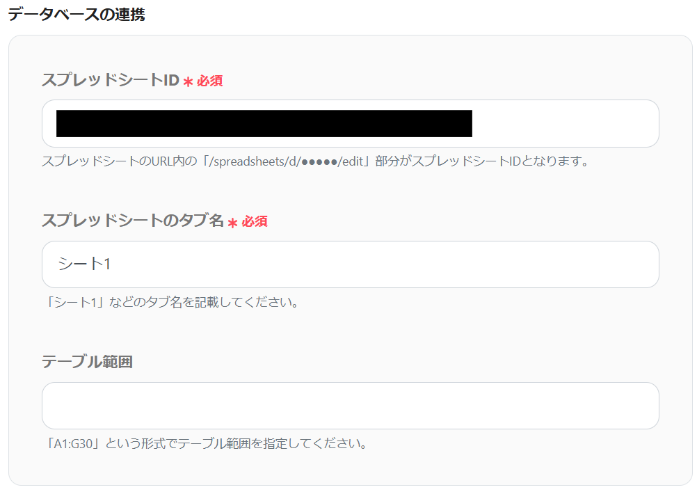 ・スプレッドシートのタブ名:対象のシート名を候補から選択します。・テーブル範囲:列名を含むすべての範囲を選択します。例えばA1からE1まで列名が入っている場合、A1:E