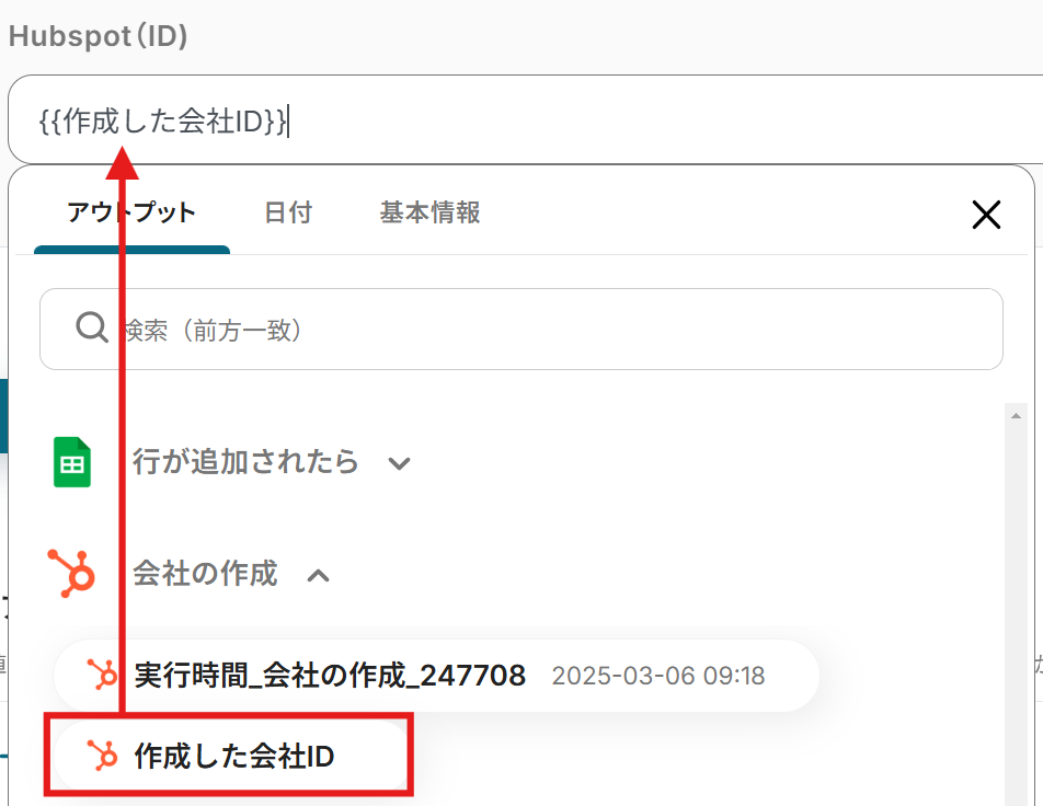 HubSpot IDを更新する設定を行うので、HubSpotのアウトプットを活用して、以下のように設定しましょう。
