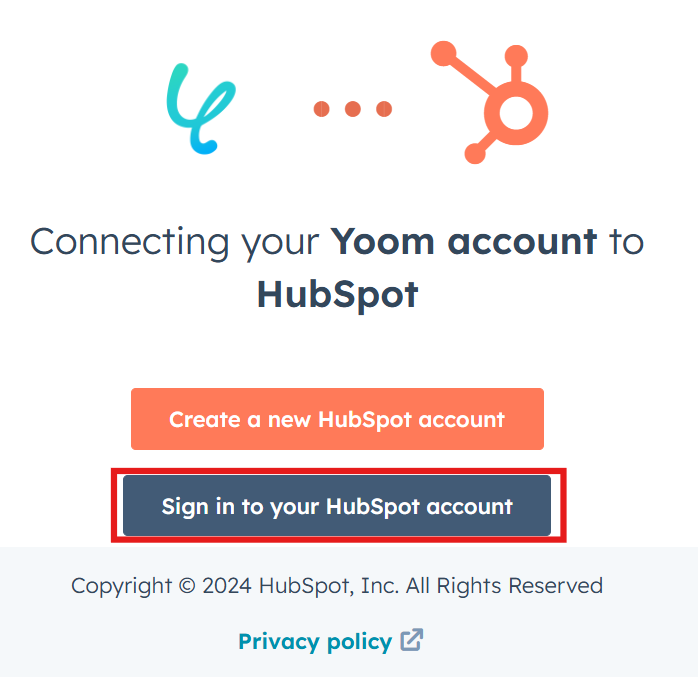 以下の画面が表示されるので、HubSpotにログインしましょう。