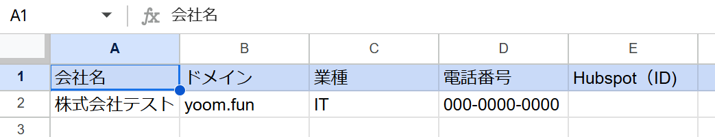 Google スプレッドシートの画面に移動し、テスト用に会社情報を設定しましょう。