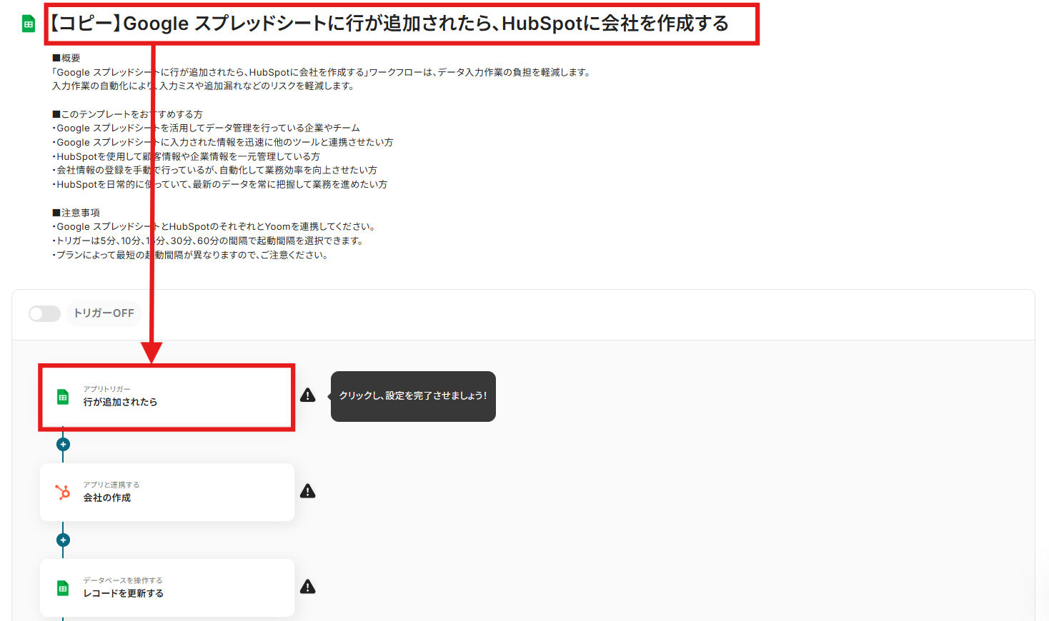 こちらのテンプレートはGoogle スプレッドシートにコンタクト情報が追加された際に、HubSpotにコンタクトを自動作成するフローとなっています。