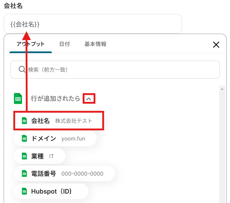 Google スプレッドシートの「行が追加されたら」のアウトプットを活用して、会社名を設定しましょう。