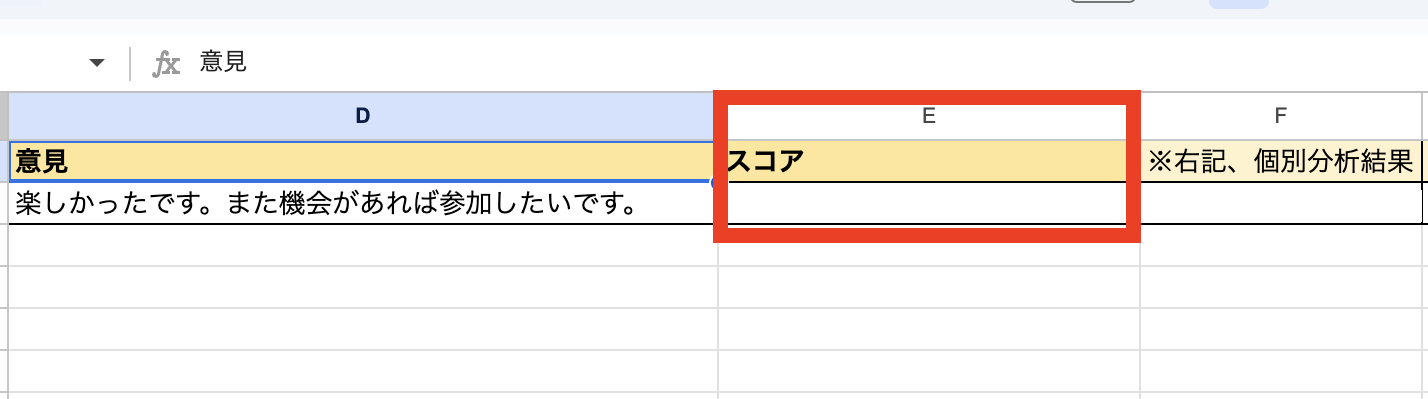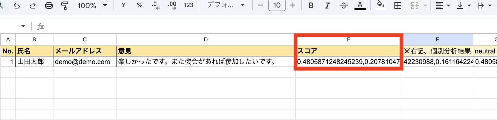 このフローボットを動作させることで、Google スプレッドシートの【スコア】に情報が追加されます。さらに、Split関数を利用しラベルやスコアを分割して、分割された結果を以降のセルへ順に反映します。