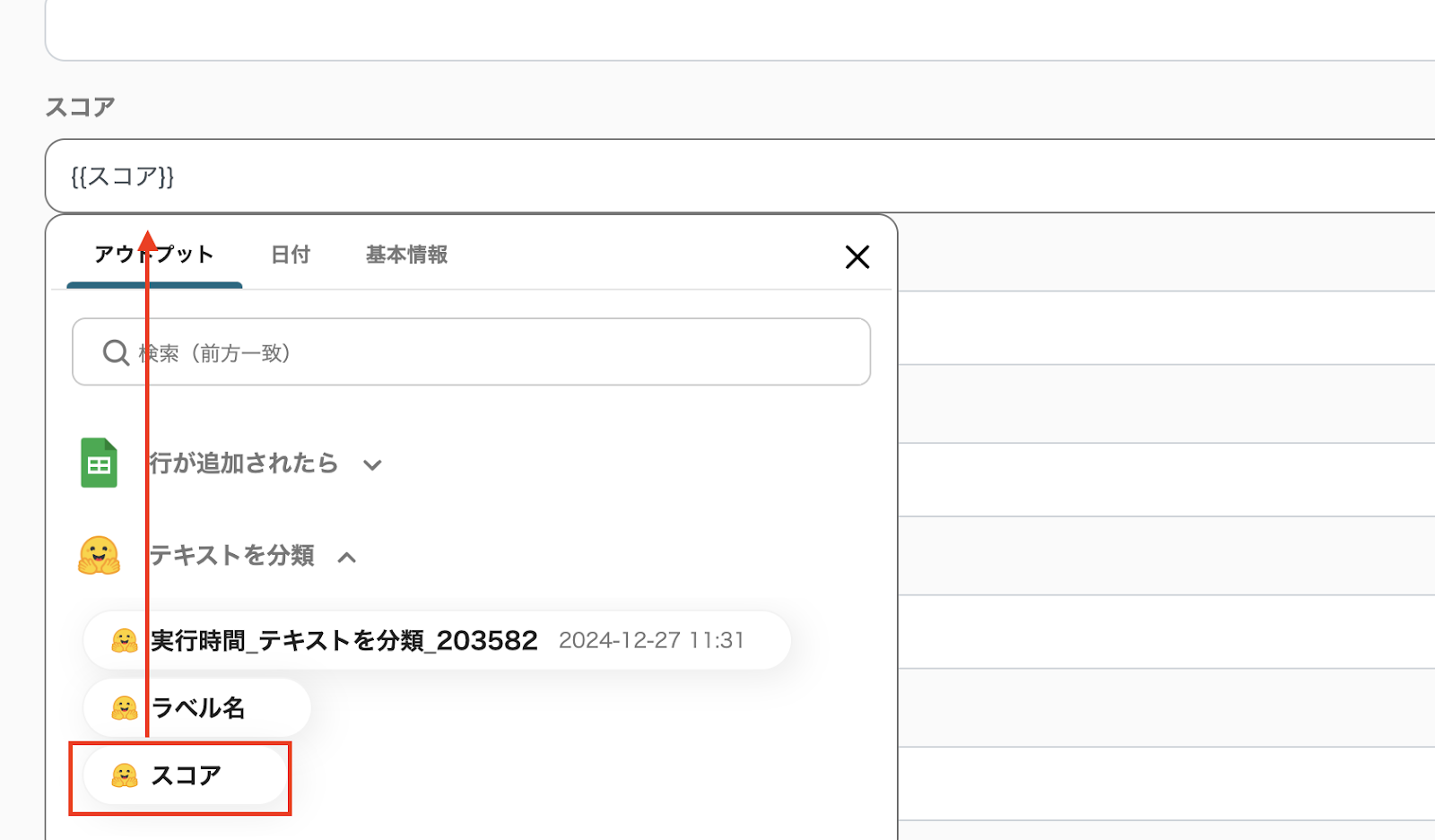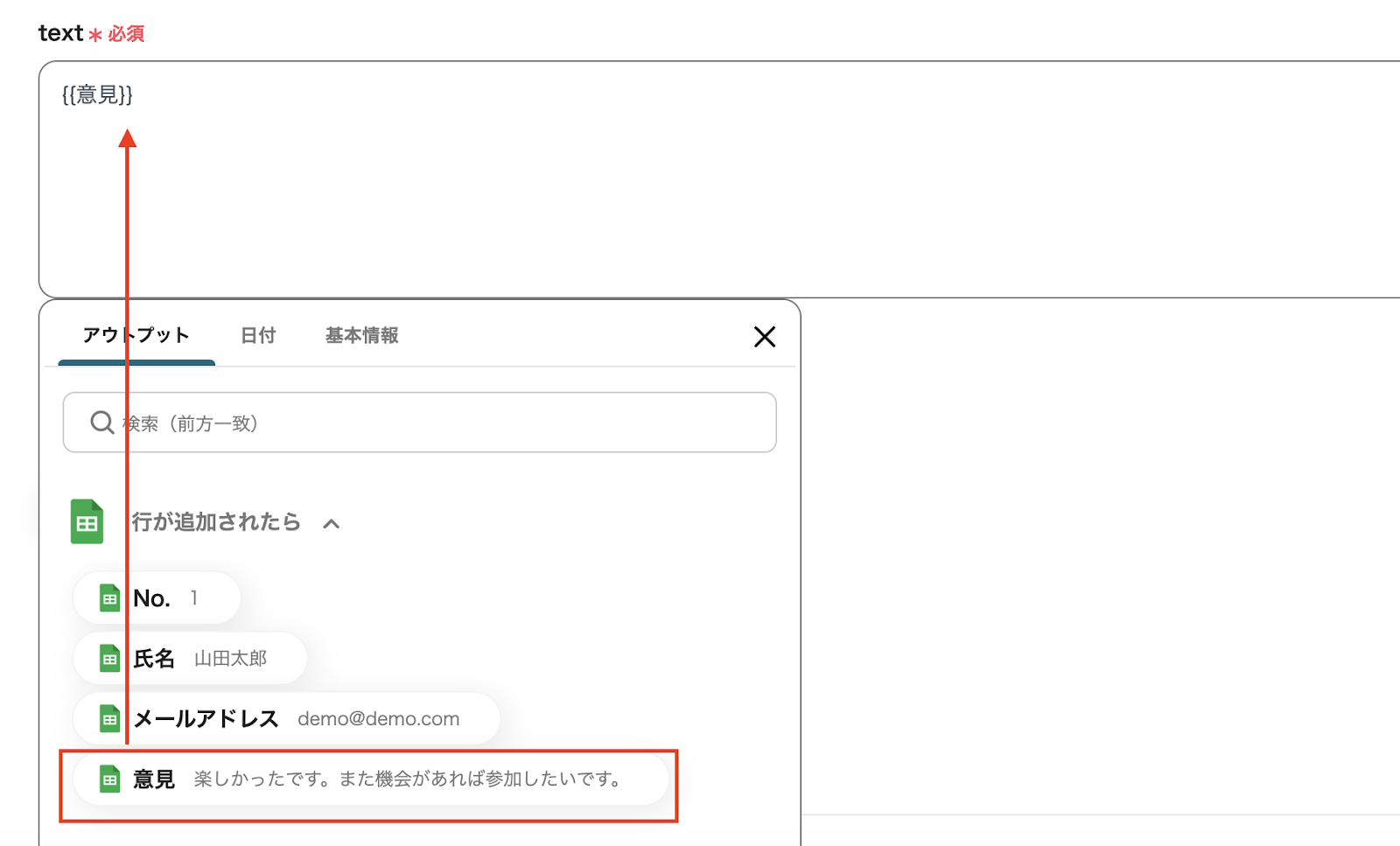 入力バーをクリックすると、前ステップから取得したアウトプットを引用できます。