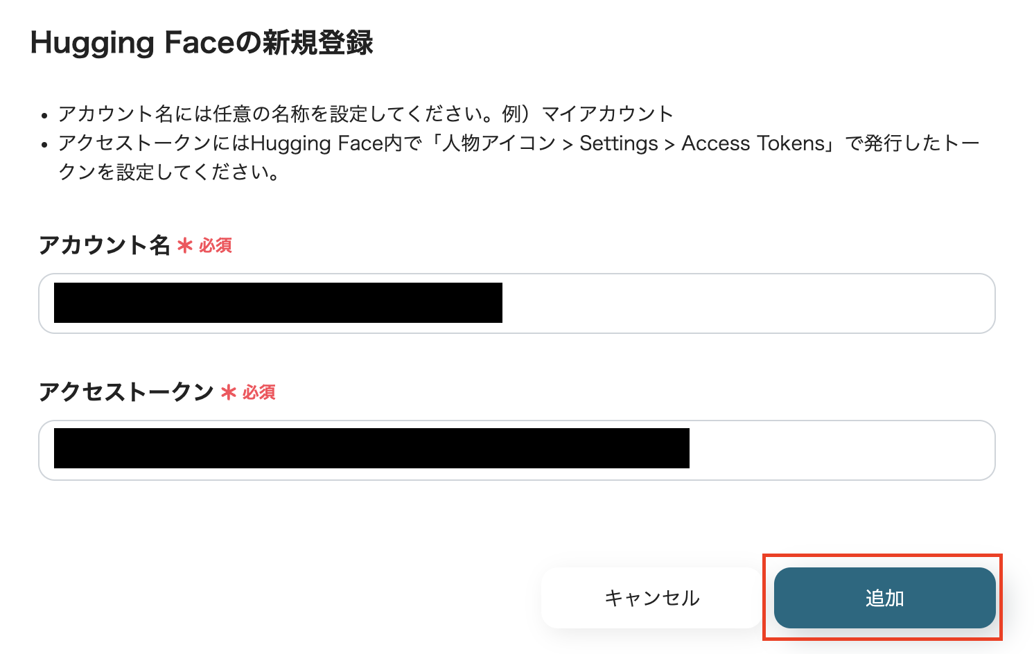 (4)「アカウント名」と「アクセストークン」を入力し、[追加]をクリックします。