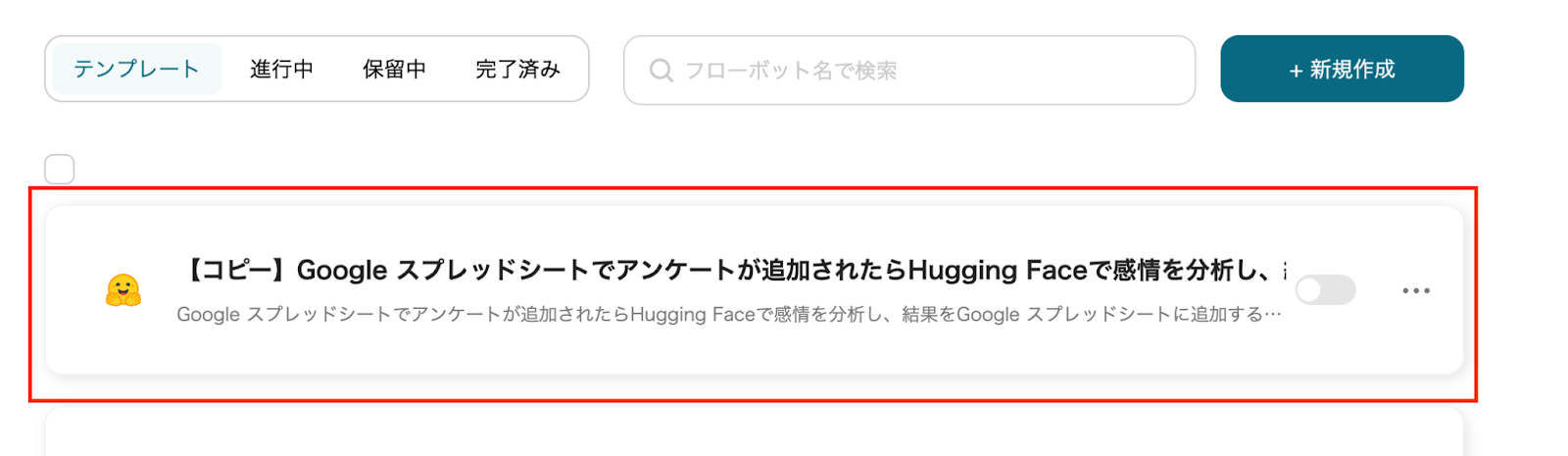 では、「Google スプレッドシートでアンケートが追加されたらHugging Faceで感情を分析し、結果をGoogle スプレッドシートに追加する」のテンプレートを使ったフローボットを作成していきましょう。