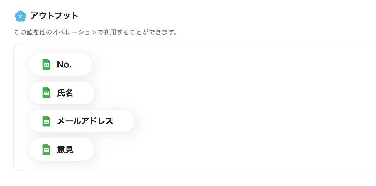 アウトプット情報は、「この値を他のオペレーションで利用することができます。」という注釈の通り、この後のステップで引用・活用できます。