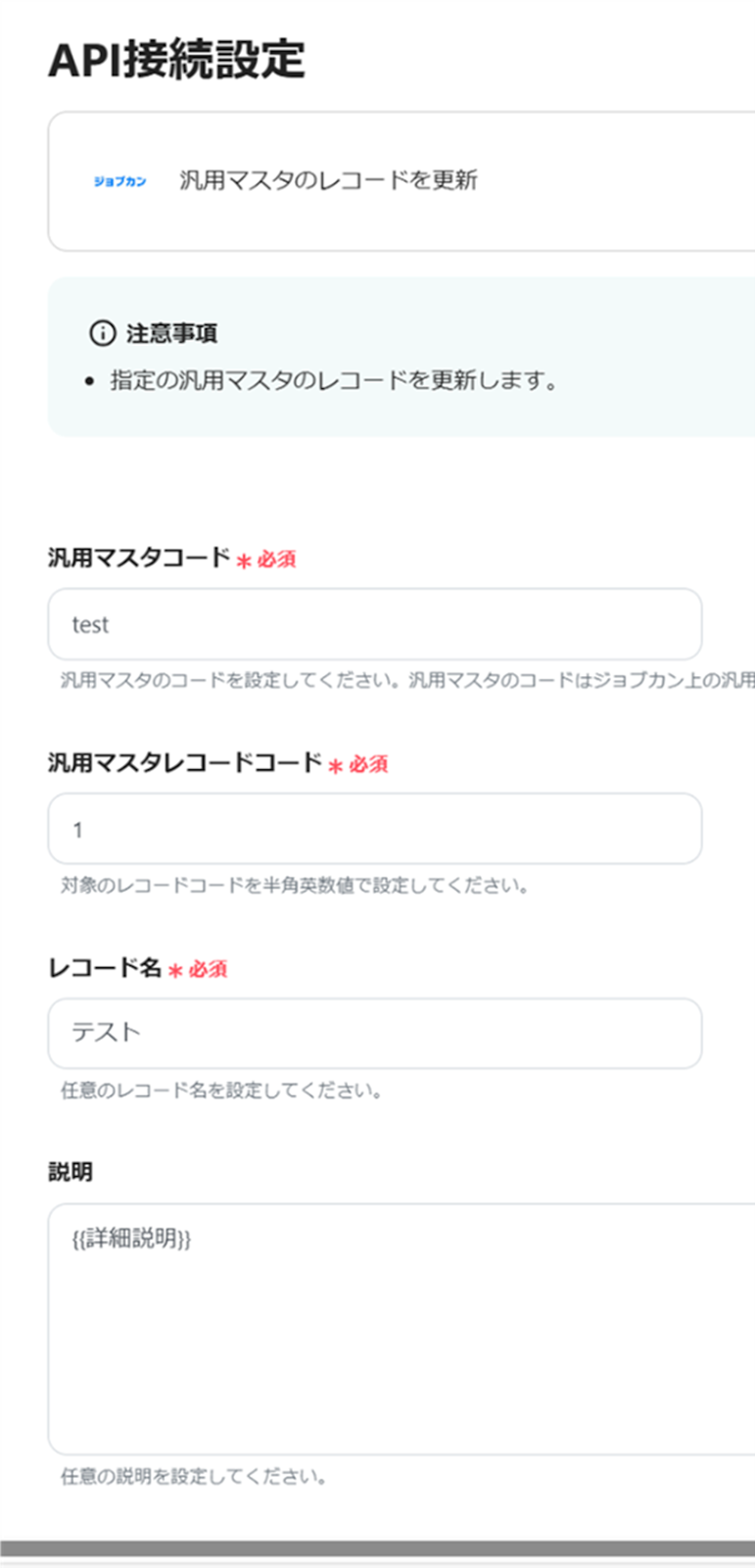 (3)API接続設定画面から汎用マスタコード、汎用マスタレコードコード、レコード名を入力します。