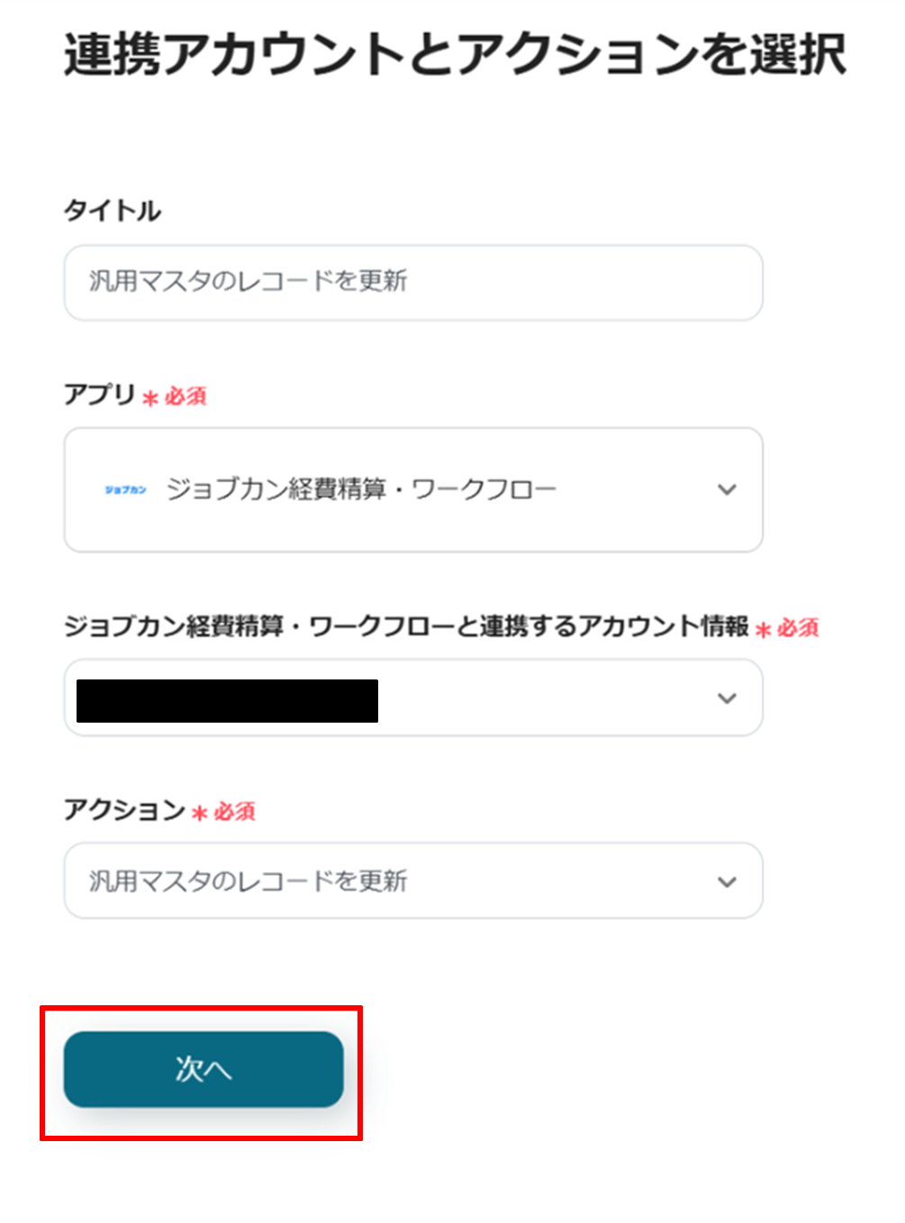 (2)ジョブカン経費精算・ワークフローの連携アカウントとアクション選択画面から、ジョブカン経費精算・ワークフローと連携するアカウント情報を確認し、アクションは「汎用マスタのレコードを更新」のままで「次へ」をクリックします。
