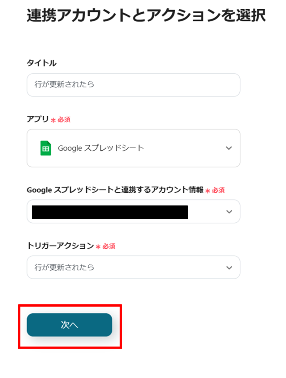 (2)Googleスプレッドシートの連携アカウントとアクションを選択画面からGoogle スプレッドシートと連携するアカウント情報を確認し、トリガーアクションは「行が更新されたら」のままで、「次へ」をクリックします。