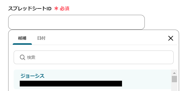 ボックス内をクリックすると画像のように一覧表示されるので、ジョーシスと連携させたいGoogle スプレッドシートを選択します。