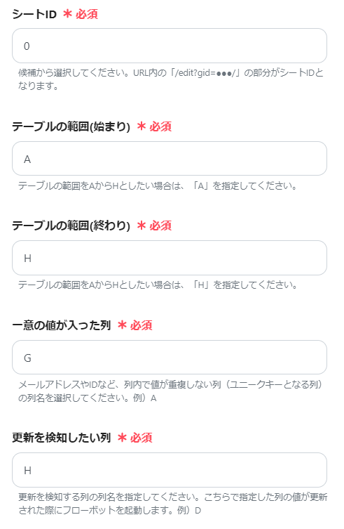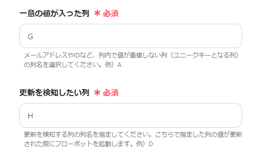 今回は、一意の値が入った列に「G=メンバーID」を、更新を検知したい列に「H=更新日」をチョイスしています