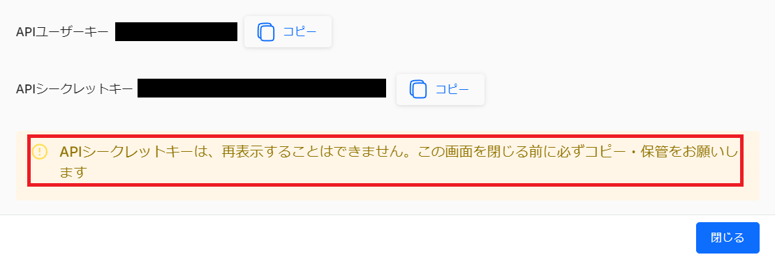 また、赤枠にあるとおりシークレットキーに関しては再表示不可能なため気を付けてくださいね!