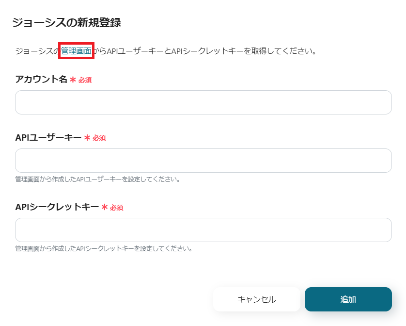 上記の画面が表示されるので、赤枠のジョーシスの管理画面を別タブで開き、APIユーザーキーとAPIシークレットキーを設定して入力しましょう。