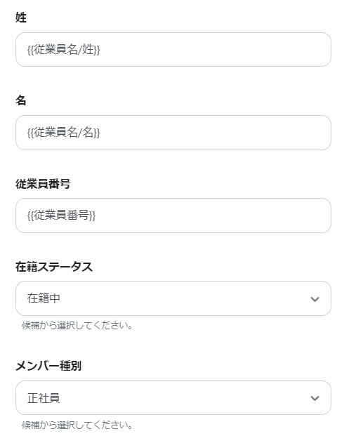 メンバーIDは先ほどジョーシスから取得した「メンバーID」です。ボックス内をクリックすると、Google スプレッドシートのトリガー設定でテスト送信した項目が選択できるようになっています。