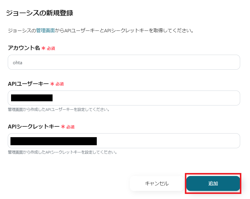 APIユーザーキーとAPIシークレットキーのペーストが完了したら追加を押して、ジョーシスとYoomの連携が完了です!