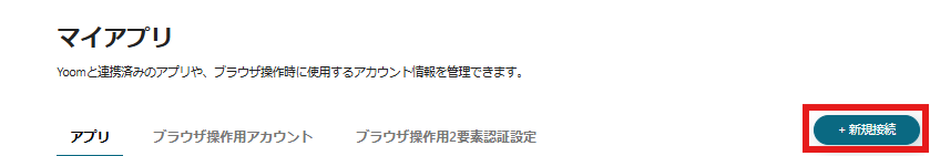 Yoomのワークスペースにログインし、マイアプリの画面内で「+新規接続」をクリックします。