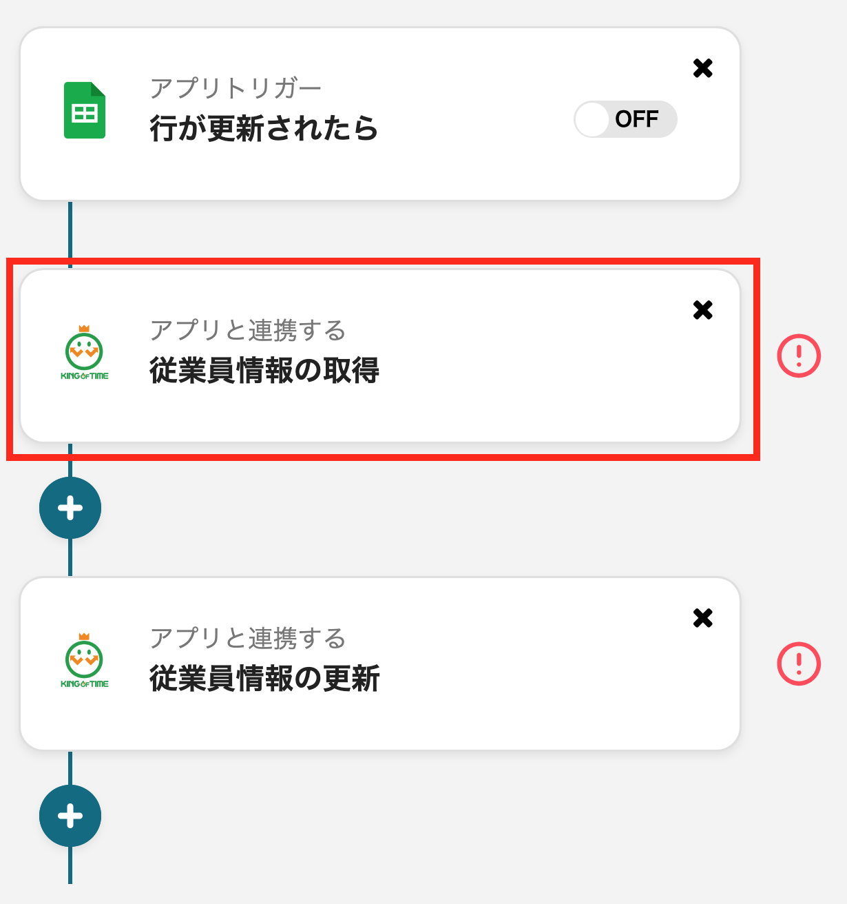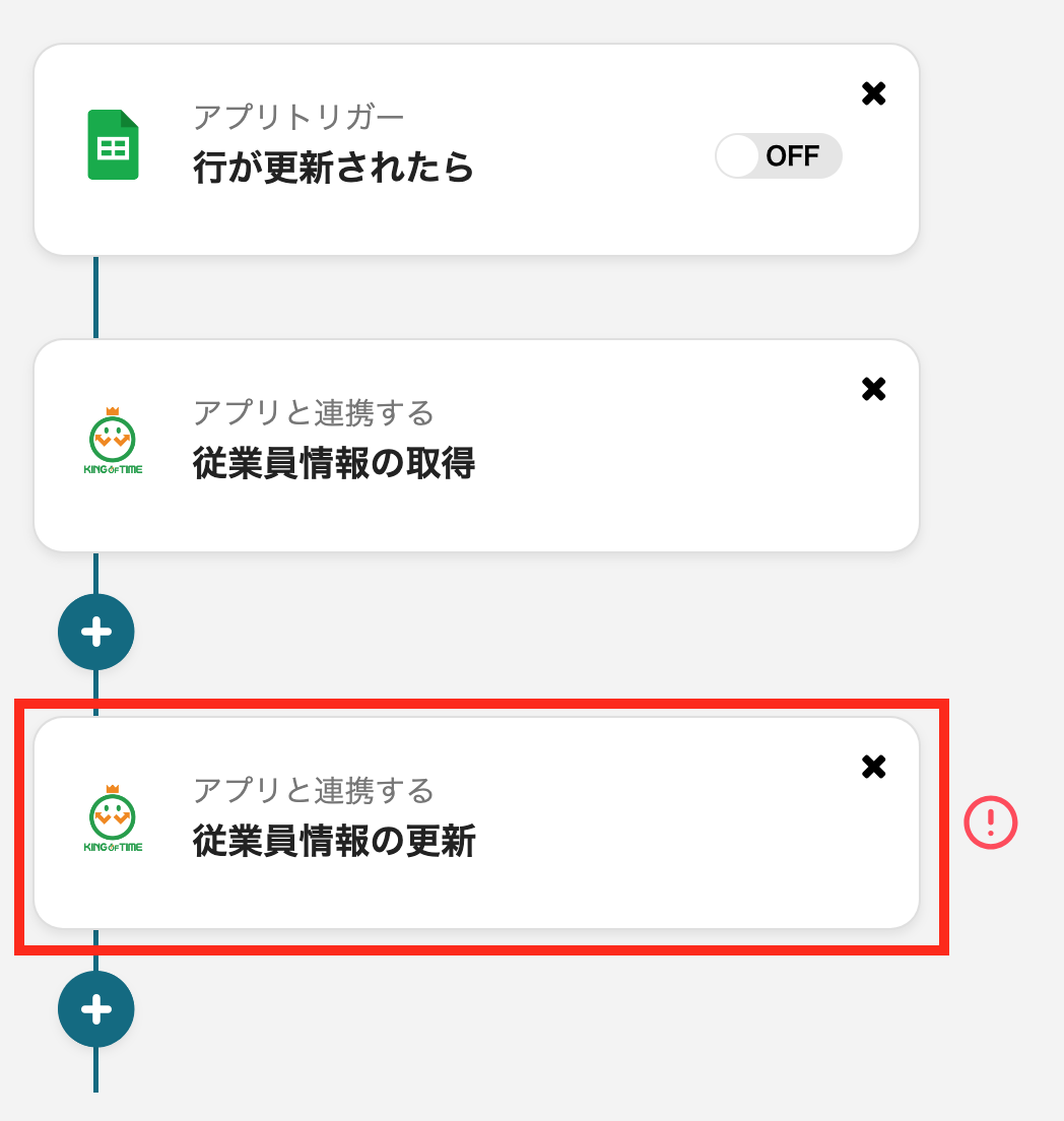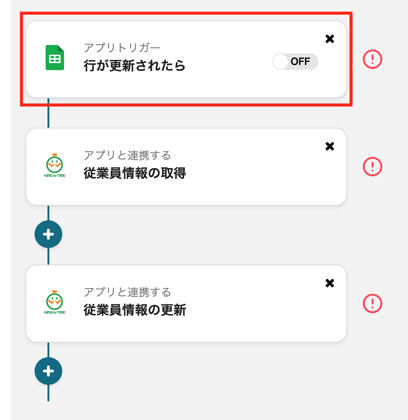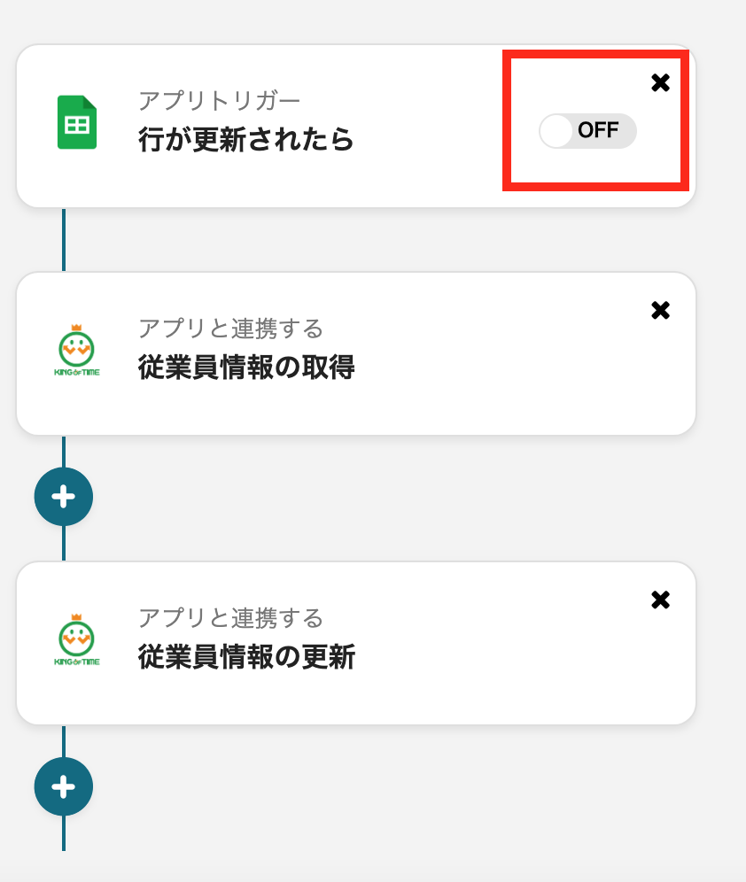 今回説明するのは「Googleスプレッドシートで行が更新されたらKING OF TIMEの従業員情報も更新する」というフローです。