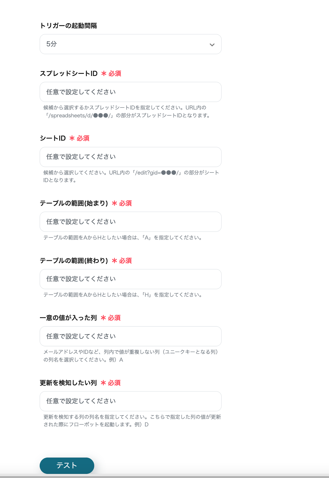 その他、それぞれの項目の入力が完了したら「テスト」ボタンを押します。
