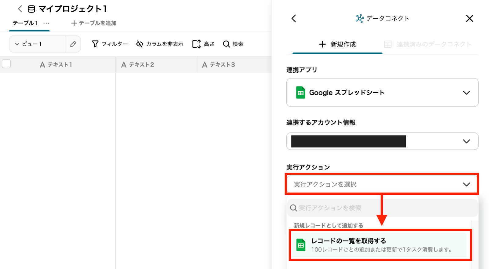 ・実行アクション:レコード一覧を取得するを選択し、「次へ」をクリックしてください。