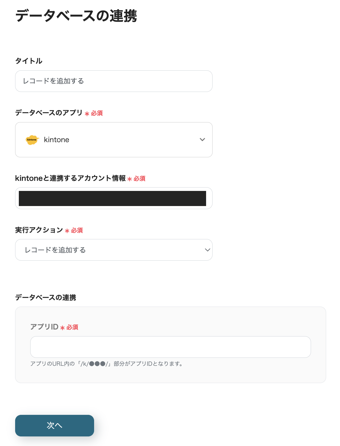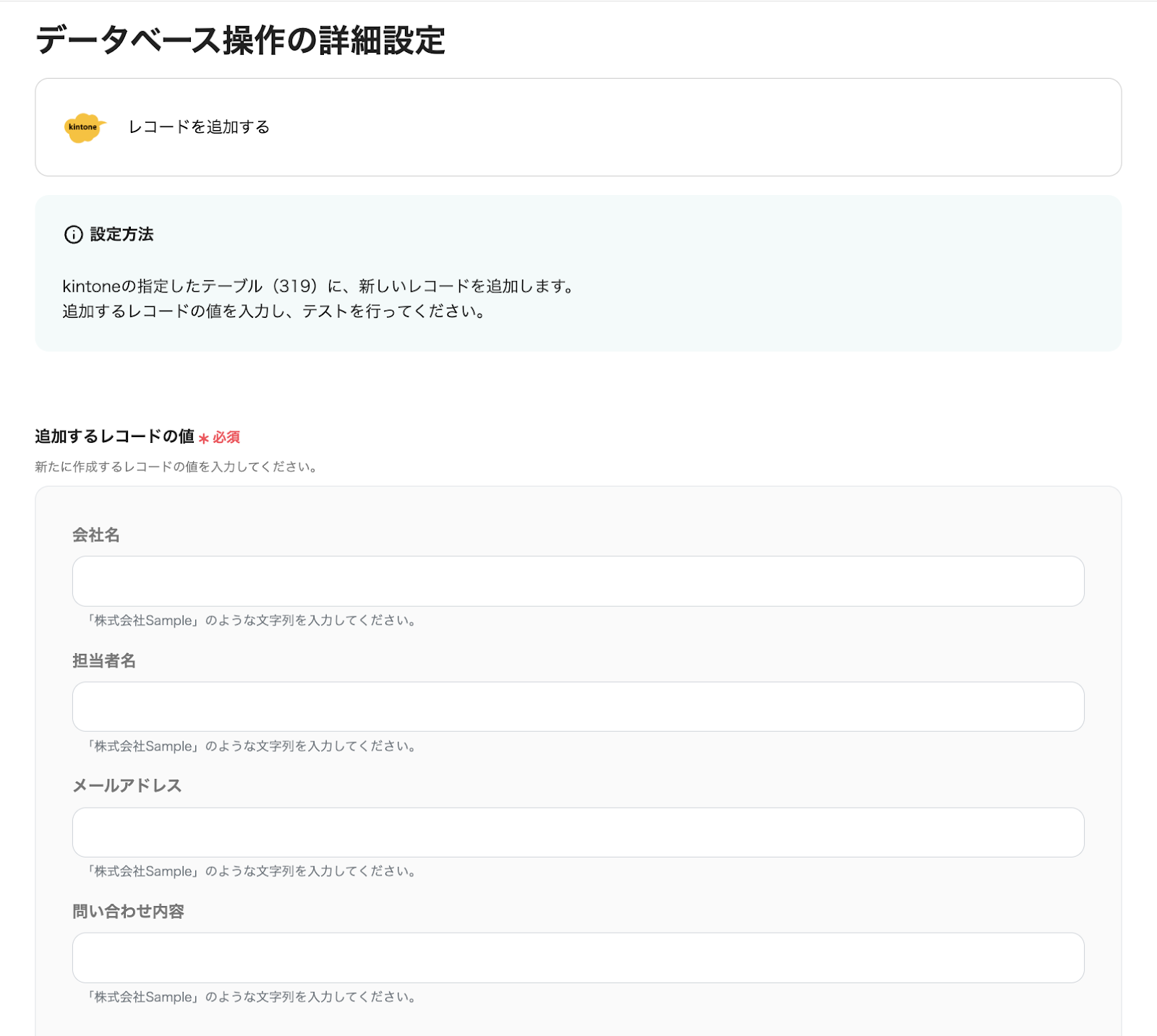 以下の「データベース操作の詳細設定」ページで、案内に従って、kintoneに追加する情報を設定します。