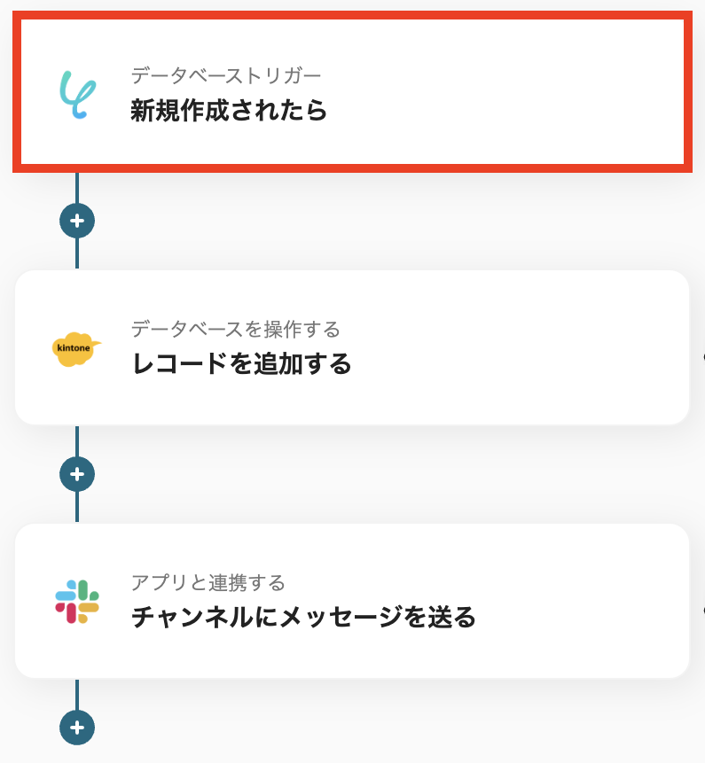 これで、Google スプレッドシートに行が追加されたら、同期したYoomデータベースにレコードが追加され、kintoneに情報を追加し、Slackに通知が送られます。