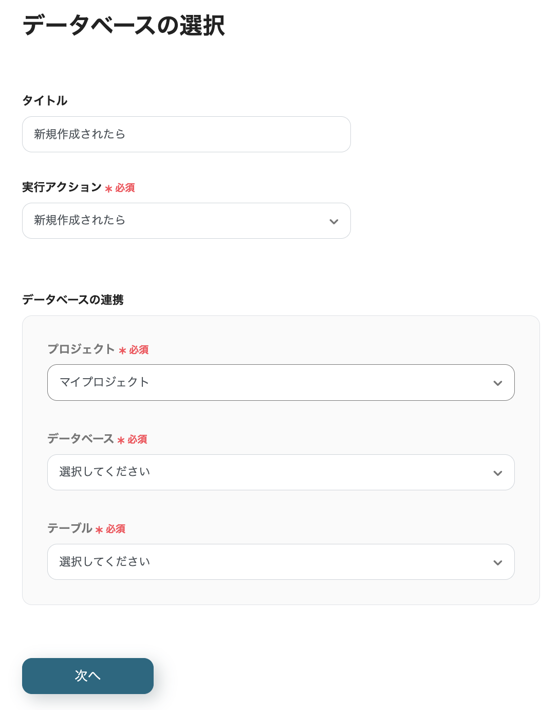 以下の「データベースの選択」ページで、「データベースの連携」の各項目を、先ほど作成したデータベースに設定します。