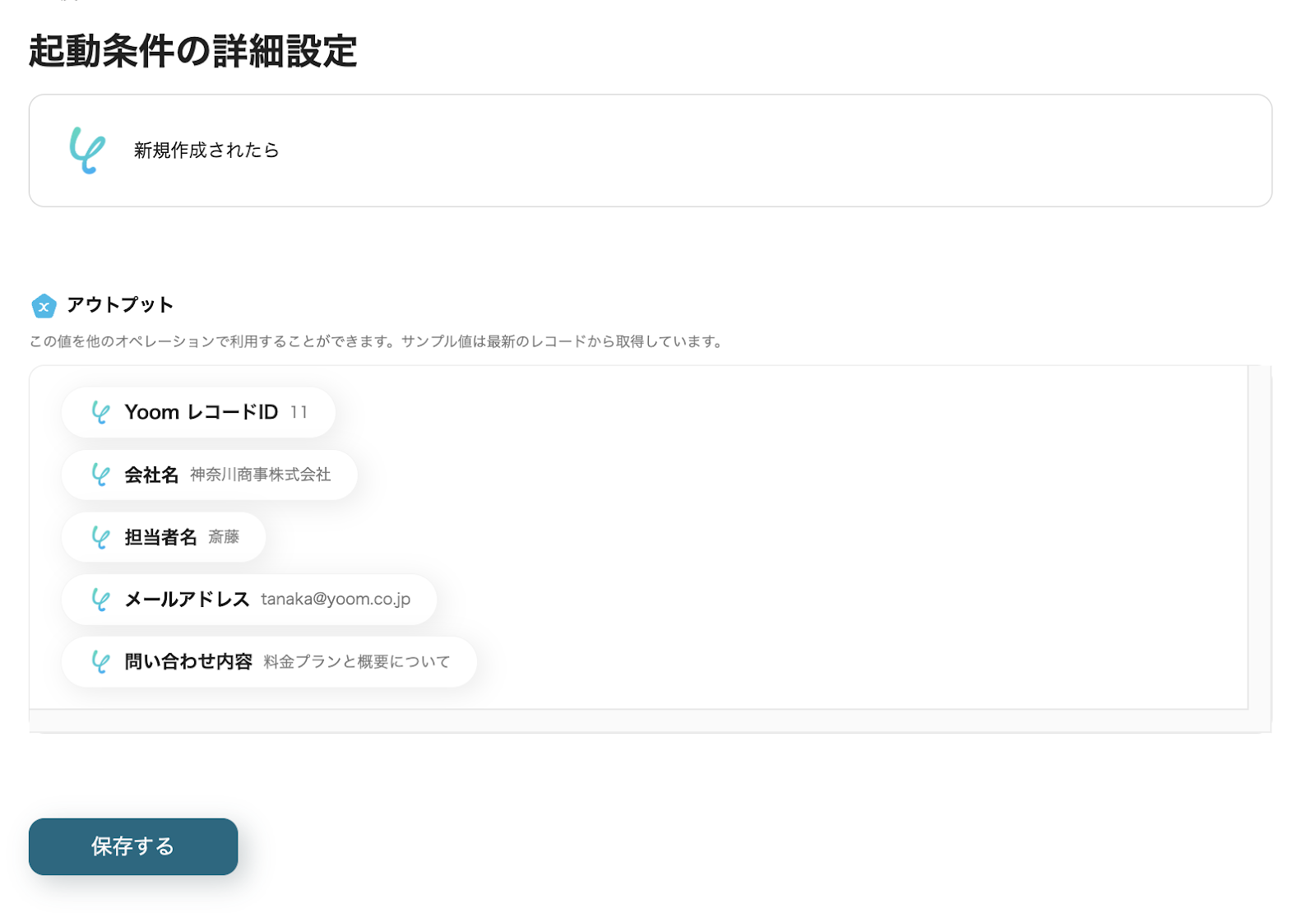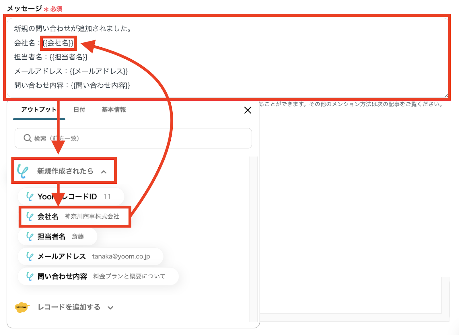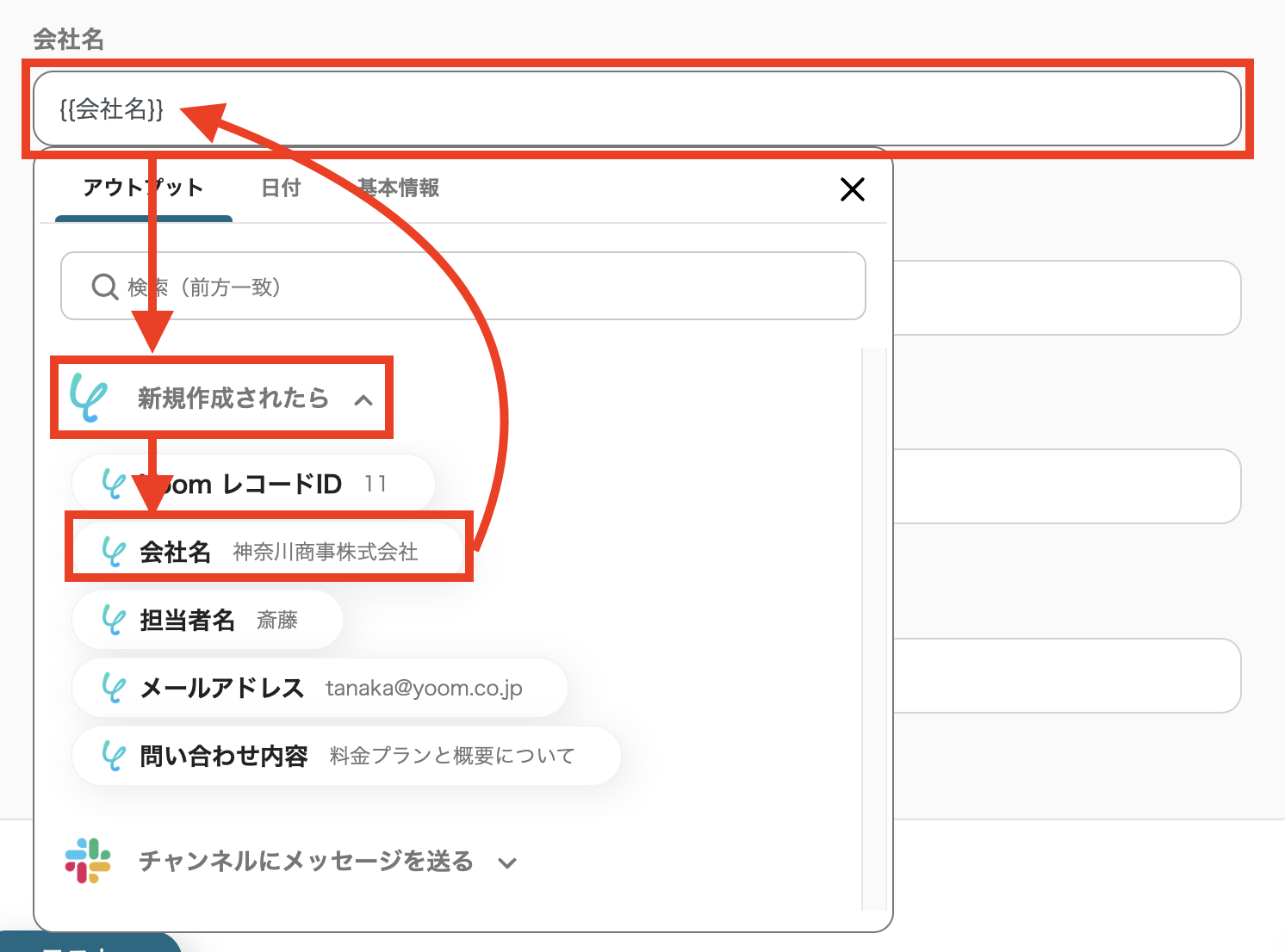 各欄をクリックし、アウトプットの中から、Yoomデータベースの該当する項目を選択してください。