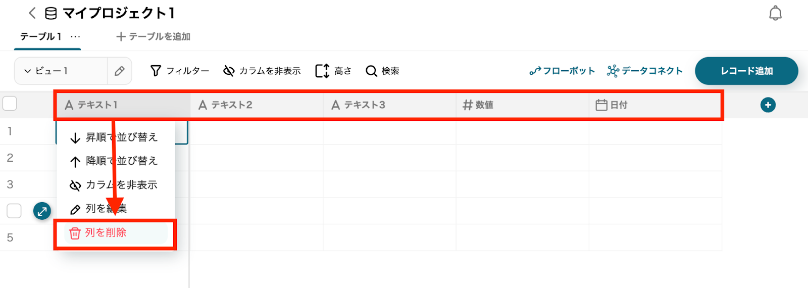 ・列の削除:各列名を選択し、表示される列の削除で一旦デフォルトの列をすべて削除してください。