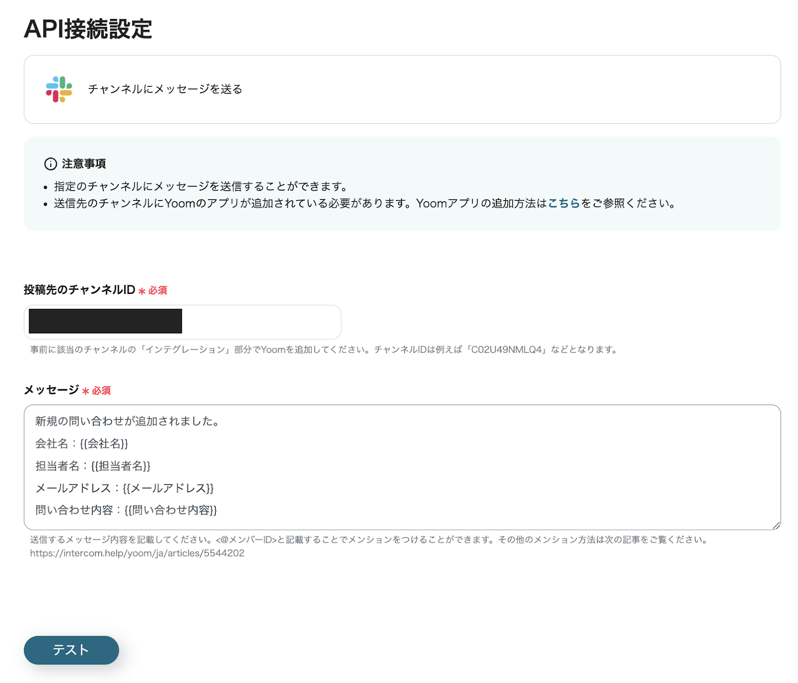 以下の「API接続設定」ページで、案内に従って「投稿先のチャンネルID」と「メッセージ」を設定してください
