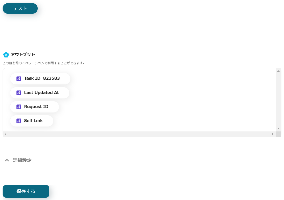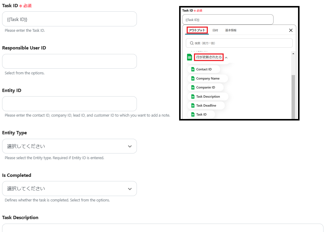 各項目は、枠をクリックして表示されるアウトプットの「行が更新されたら」から選択すると、タスクごとに変わる値を動的に反映できます。