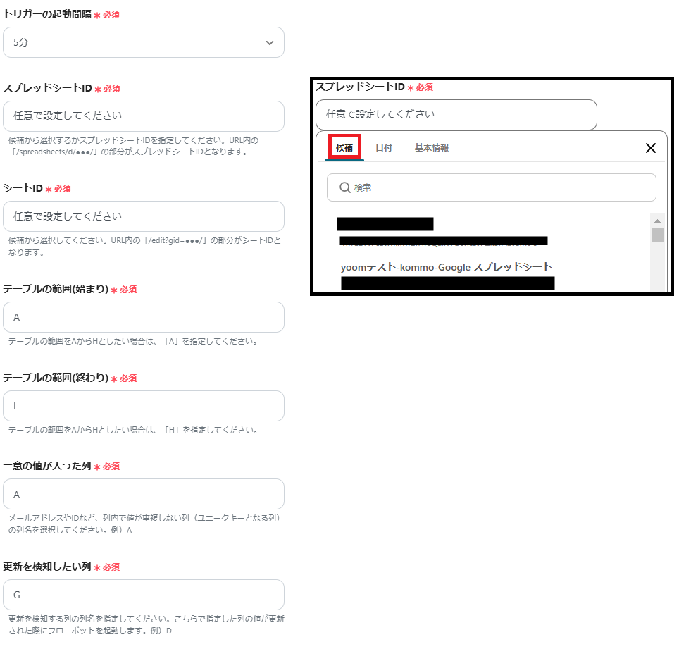 ※スプレッドシートIDとシートIDは、枠をクリックして表示される「候補」から選択できます。