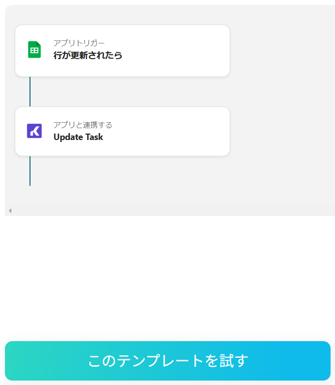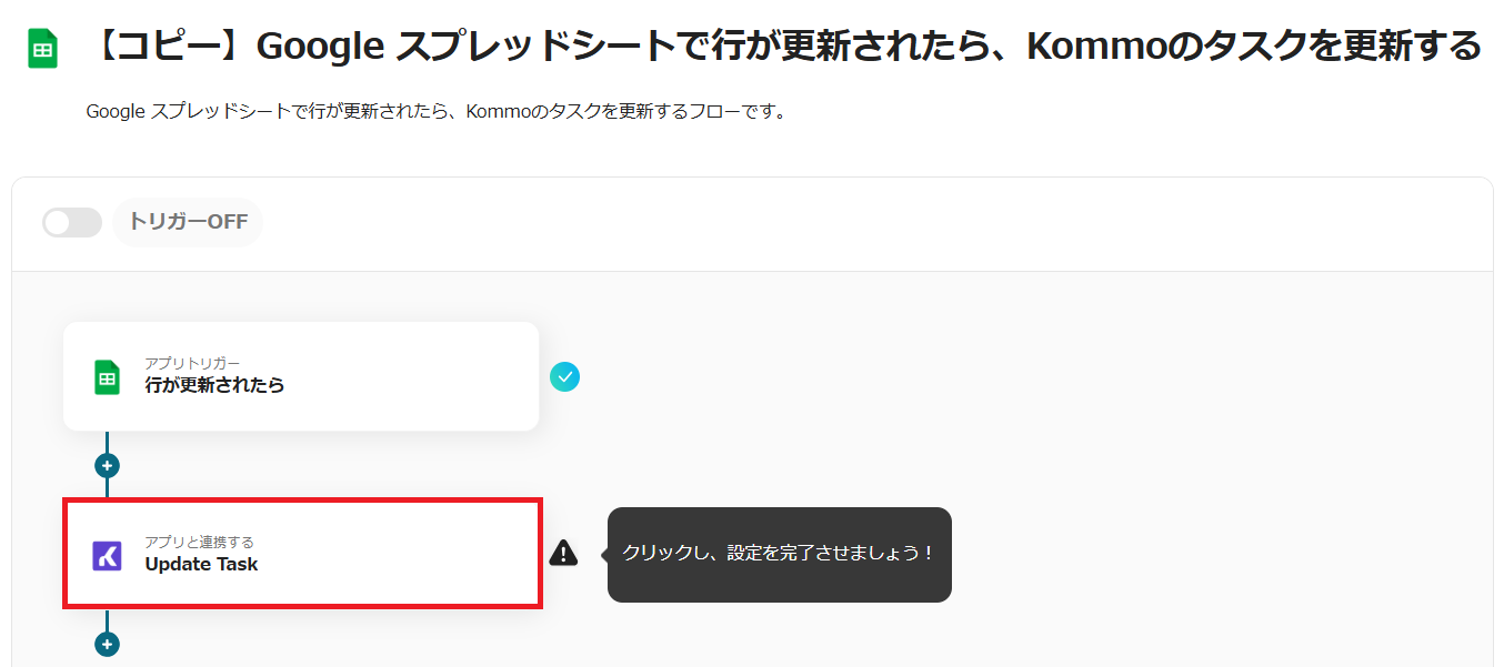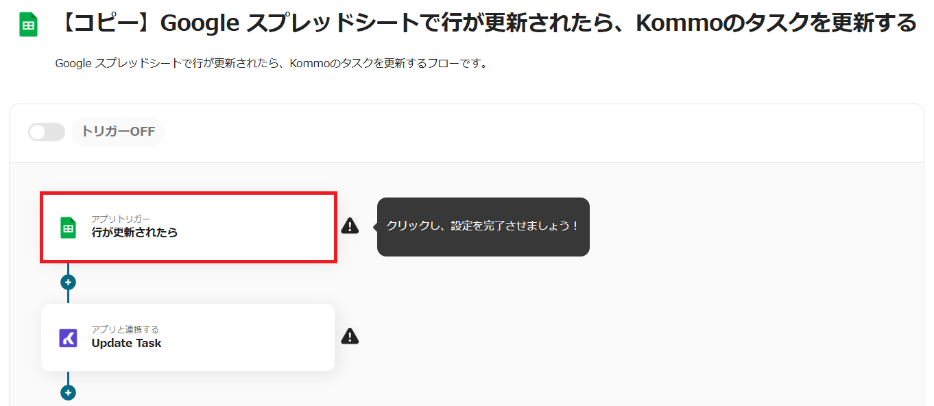 このフローは、Google スプレッドシートの特定のタスク情報が更新されるとトリガーが起動します。